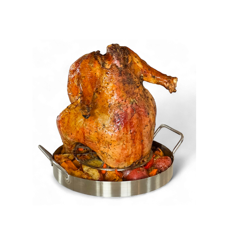 Built to replicate the airflow and fat-rendering fundamentals used in professional vertical roasting—inside a standard home oven.