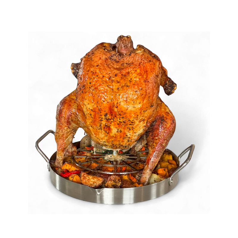 Delivers evenly roasted, crispy skin with better airflow than traditional beer can methods - cleaner and more effective.